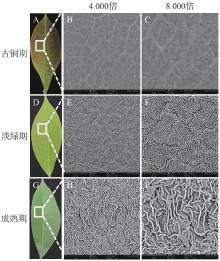 A、D、G分别为古铜期、淡绿期和成熟期橡胶树叶片,B、E、H为放大4 000倍,C、F、I为放大8 000倍。